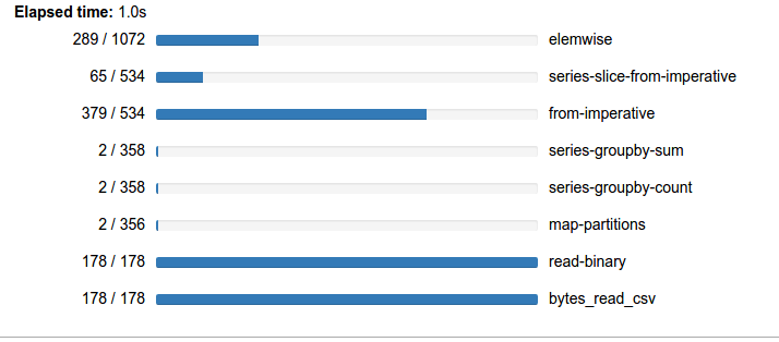 If you look at the groupby computations above you can add the numbers in the progress bars to show that we computed around 3000 tasks in around 7s. It looks like this computation is about half scheduler overhead and about half bound by actual computation.