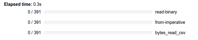 This head computation is about as fast as a film projector. You could perform this roundtrip computation between every consecutive frame of a movie; to a human eye this appears fluid. In the last post we asked about how low we could bring latency. In that post we were running computations from my laptop in California and so were bound by transcontinental latencies of 200ms. This time, because we’re operating from the cluster, we can get down to 20ms. We’re only able to be this fast because we touch only a single data element, the first partition. Things change when we need to touch the entire dataset.