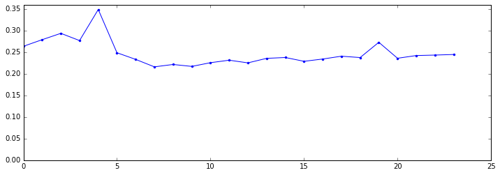 We plot this with matplotlib and see a nice trough during business hours with a surge in the early morning with an astonishing peak of 34% at 4am: