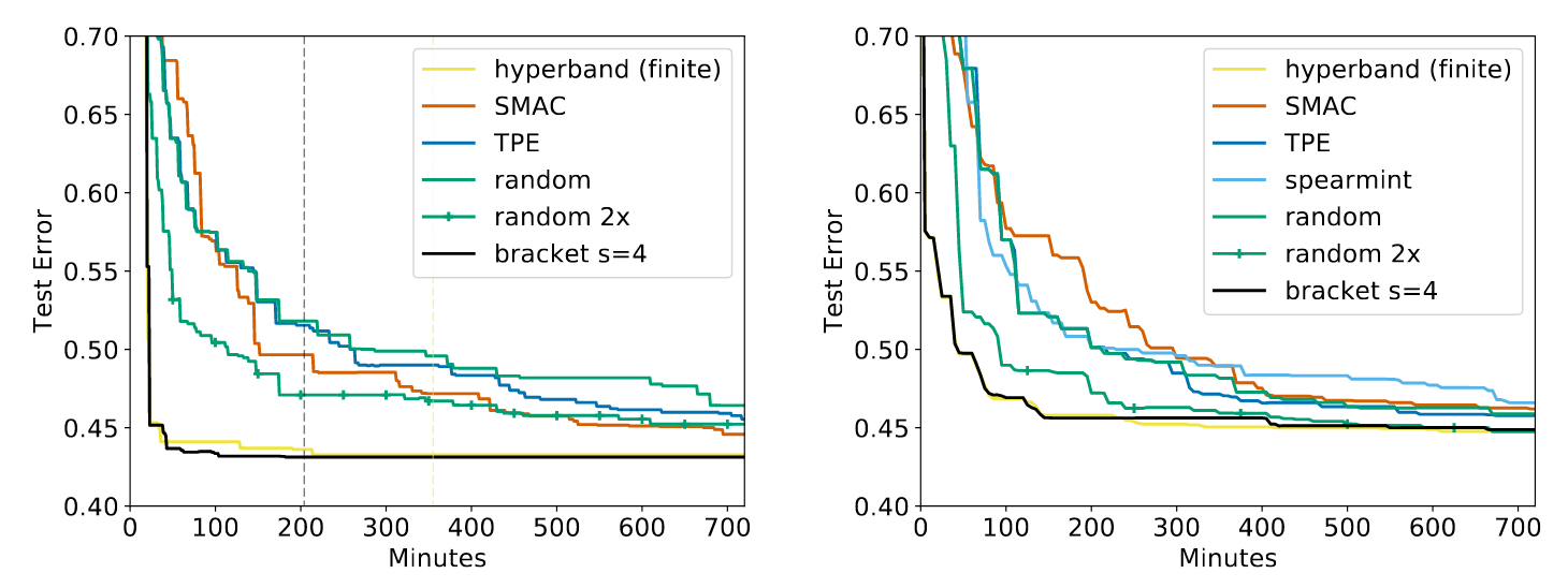 Hyperband works. As such, it’s very popular. After the introduction of Hyperband in 2016 by Li et. al, the paper has been cited over 470 times and has been implemented in many different libraries including Dask-ML, Ray Tune, keras-tune, Optuna, AutoML,1 and Microsoft’s NNI. The original paper shows a rather drastic improvement over all the relevant implementations,2 and this drastic improvement persists in follow-up works.3 Some illustrative results from Hyperband are below:
