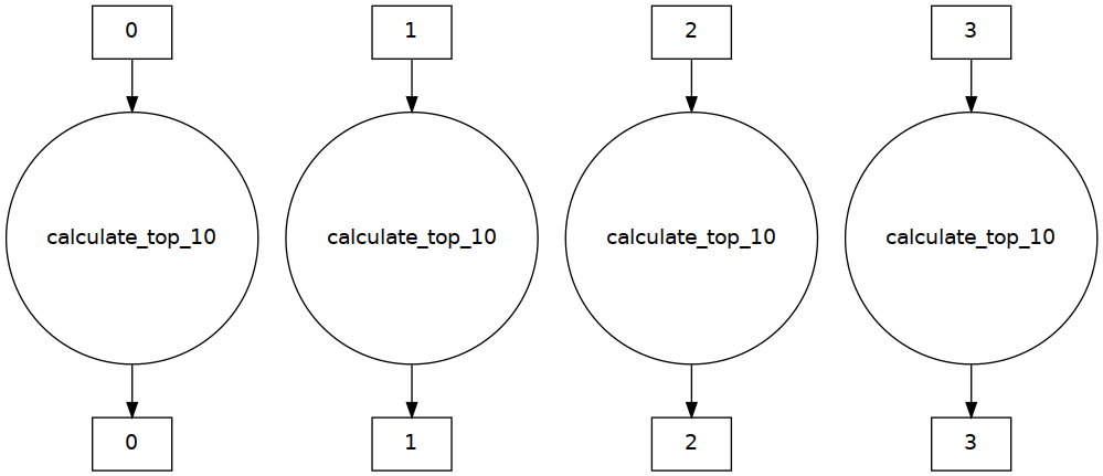 For example, if I provisioned a virtual machine with 4 CPU cores, to process the data I could start four processes, and each would max out a single core. If I had 12 inputs and each processing step took about the same time, they might run as follows: